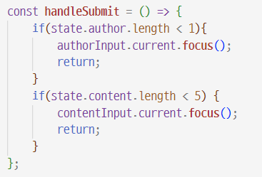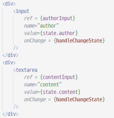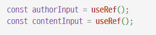 input 태그와 textarea 태그에 각각 ref = {authorInput}, ref = {contentInput} 를 써준다.