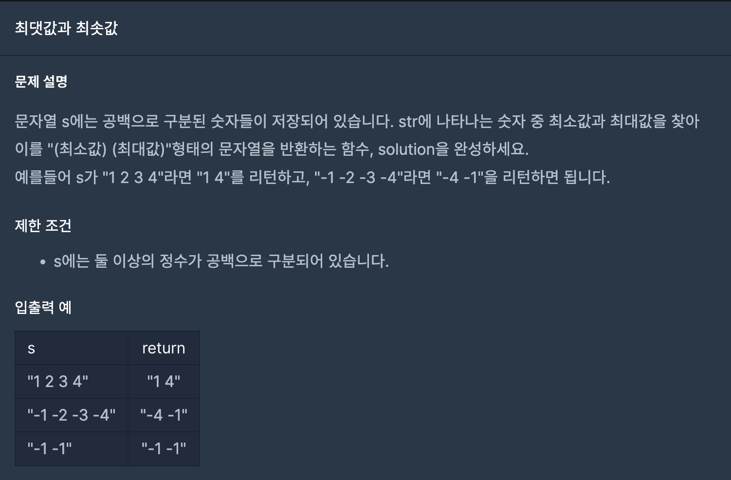 -> 원래 정렬한 후 s[0] + " " + s[length-1]을 리턴하려고 했는데 뭔가 잘 되지 않아서 min과 max를 사용했다.